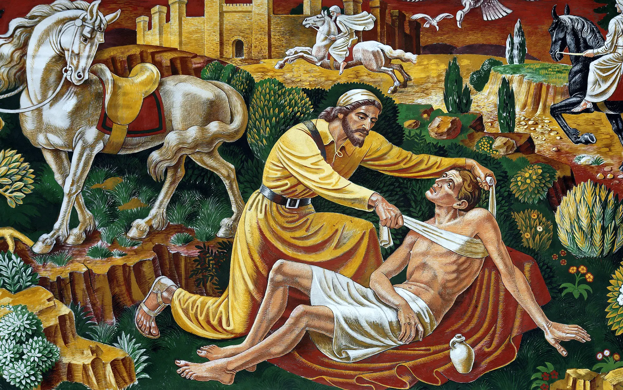 Pewien zaś Samarytanin, wędrując, przyszedł również na to miejsce. Gdy go zobaczył, wzruszył się głęboko: podszedł do niego i opatrzył mu rany, zalewając je oliwą i winem; potem wsadził go na swoje bydlę, zawiózł do gospody i pielęgnował go. Następnego zaś dnia wyjął dwa denary, dał gospodarzowi i rzekł: „Miej o nim staranie, a jeśli co więcej wydasz, ja oddam tobie, gdy będę wracał”.